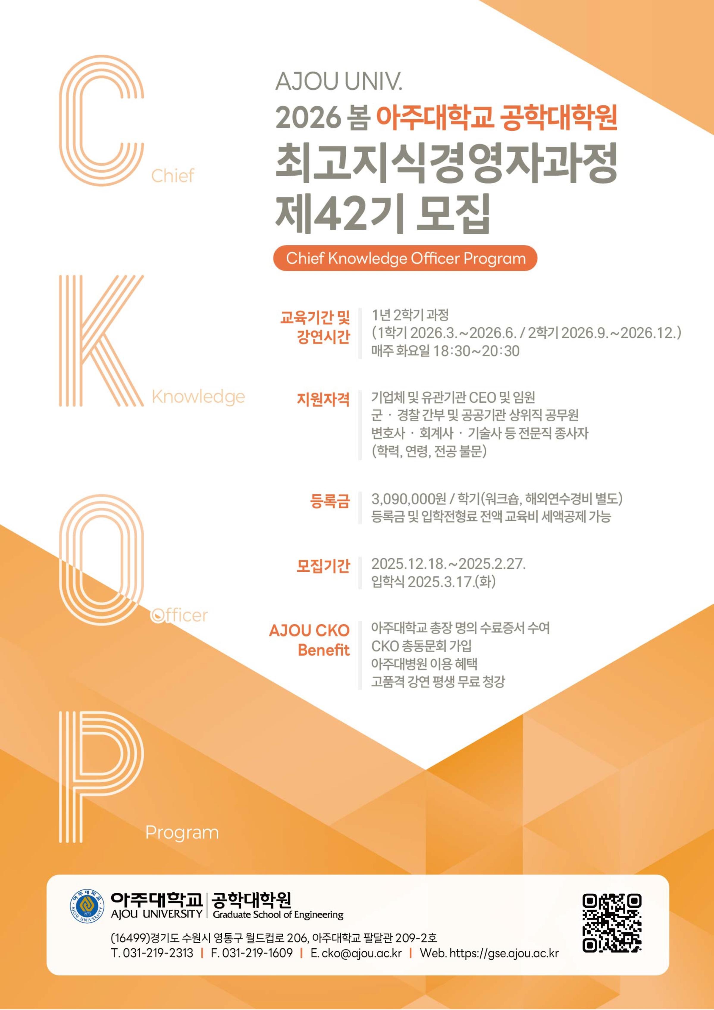 2026학년도 봄학기 공학대학원 최고지식경영자과정 제 42기 신입생 모집을 실시합니다.