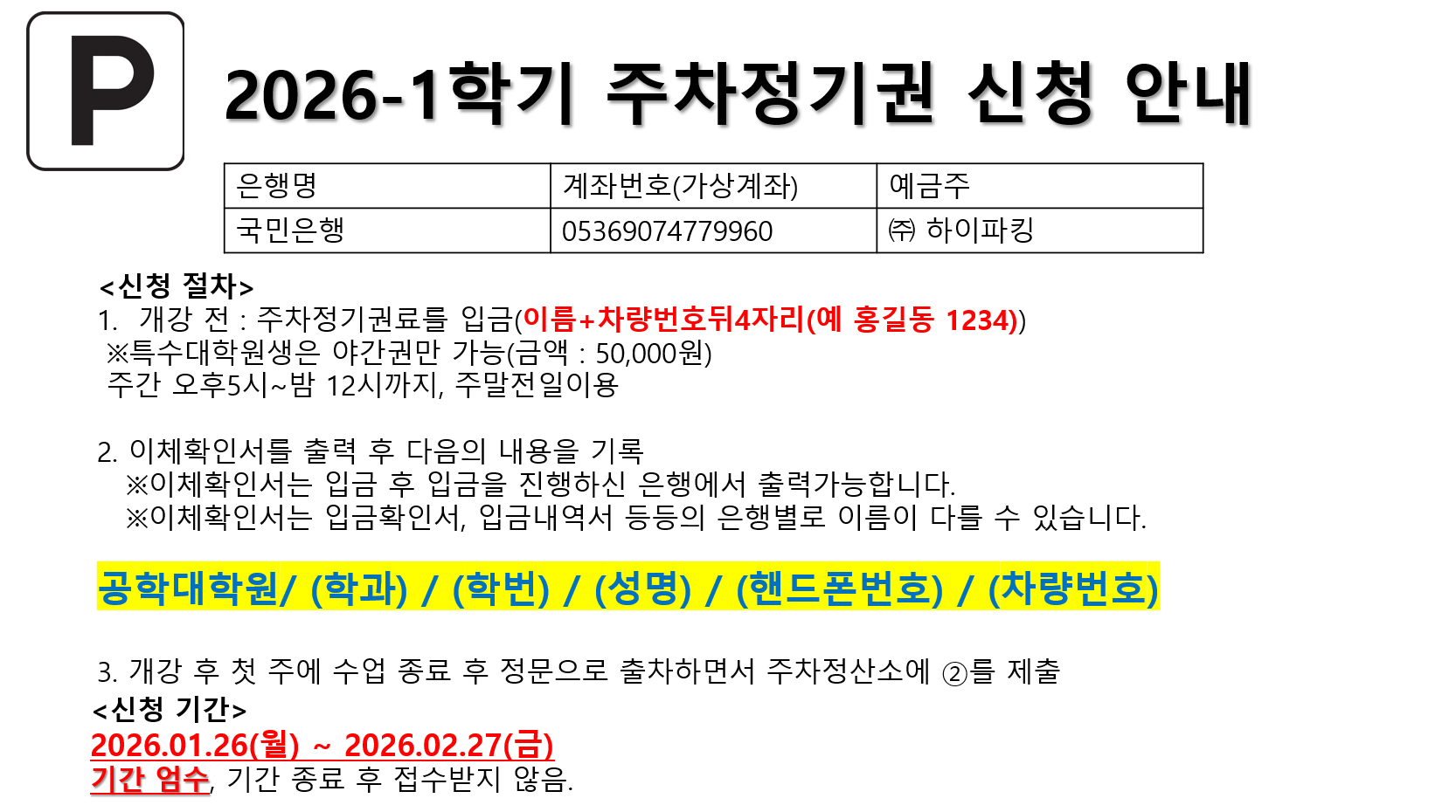 [학사] [공학대학원] 2026-1학기 주차정기권 신청 안내